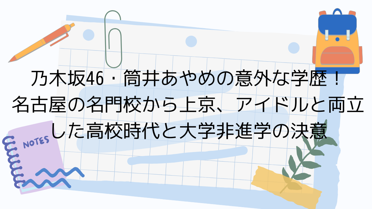 筒井あやめさんの最終学歴は、目黒日本大学高等学校(通信制課程)卒業です。 中学2年生の時に坂道合同オーディションに合格し、乃木坂46の4期生としてデビュー。地元・名古屋を離れ、学業とアイドル活動を両立させる道を選びました。